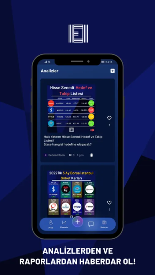 Analziler sekmesinde günlük teknik analizleri takip edebilir ve hisse senetleri hakkında bilgiye sahip olabilirsin. Bu sayede borsadaki terimleri analizlerimizi okuyarak kolayca öğrenebilirsin. Ayrıca paylaşılan analizlere yorum yapabilir ve beğenebilirsin. Hisse senetleri, kripto paralar, altın, döviz kurları ve endekslerin temel analz ve teknik analizlerini "Analizler" kategorisinde bulabilirsiniz.