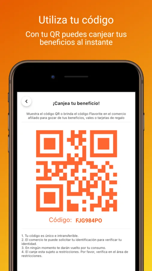- Utilizar tú código QR para hacer canjes. Ya no tienes que brindar tu código, solo abre la aplicación y muestra tú código QR en nuestros comercios afiliados.