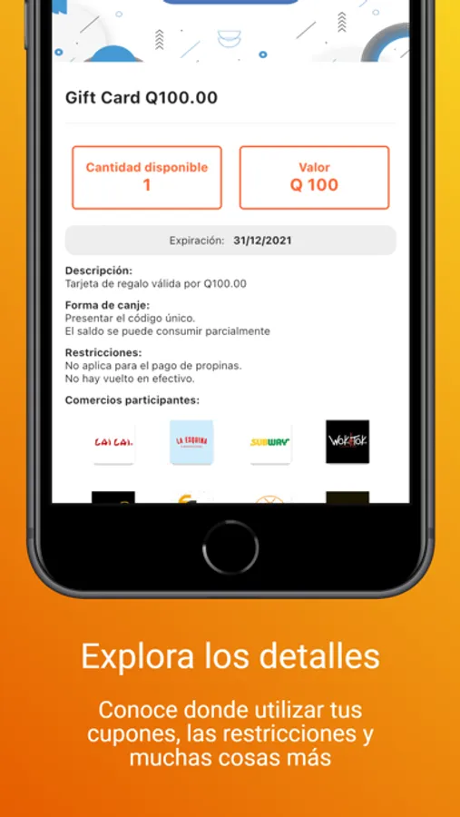 - Explorar tus cupones y tarjetas de regalo. Conocer el monto, ver comercios participantes, descripción y forma de uso.