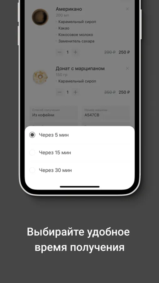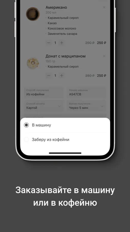 • Не выходя из машины. Пока вы подъезжаете к выбранной Вами кофейне, Ваш кофе уже готовится и Вам его принесут прям в машину.