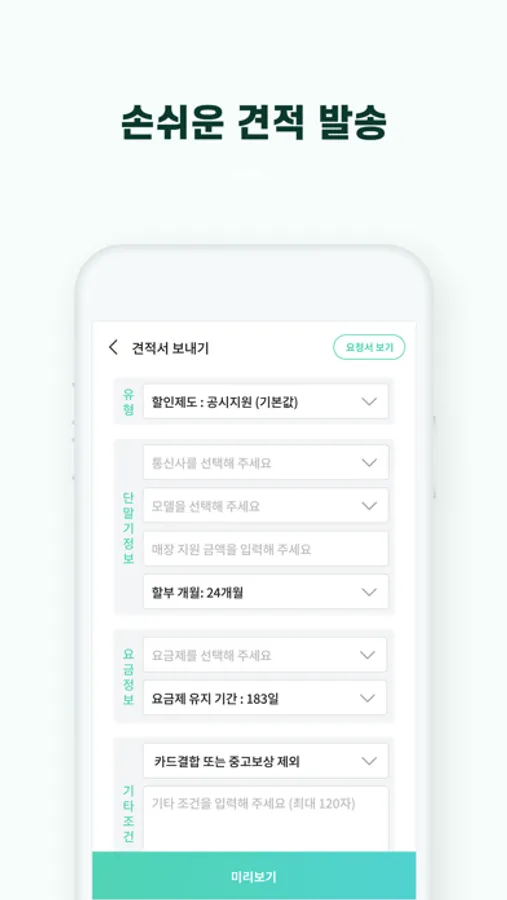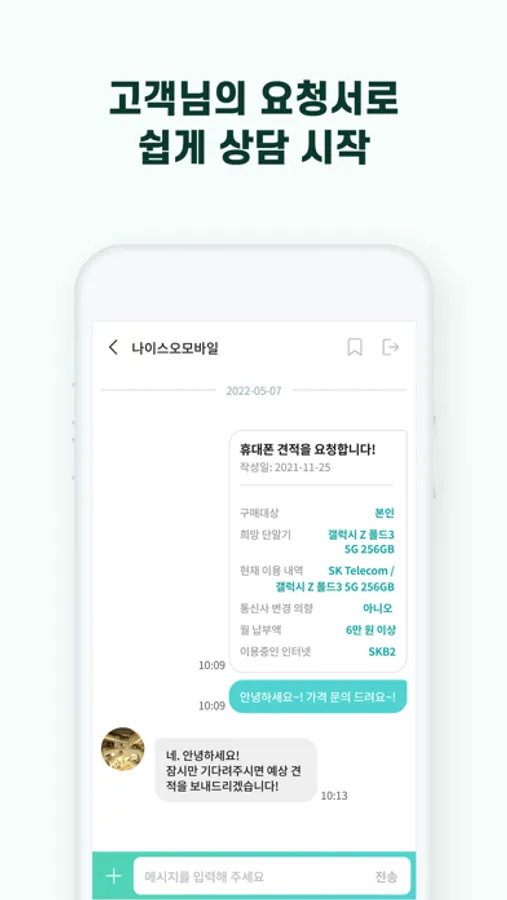 · 일일이 물어보지 않아도 고객님의 요청서(구매 또는 변경할 휴대폰 정보)를 보고 쉽게 견적 발송이 가능합니다.