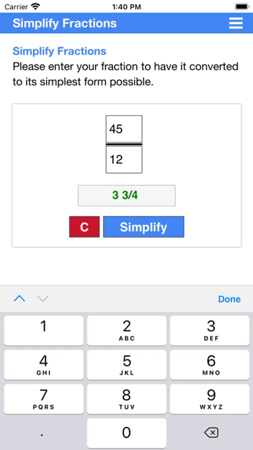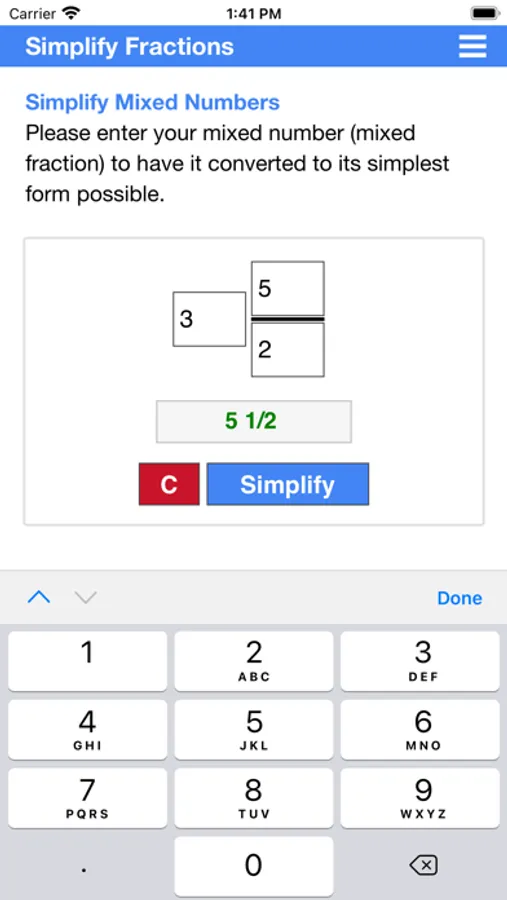 This app can not only simplify fractions, but it can also simplify mixed numbers (mixed fractions). It can calculate and simplify both proper and improper fractions.