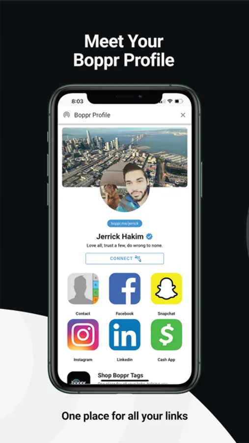 Boppr is the future of connection where one device can share your information with an unlimited amount of people.