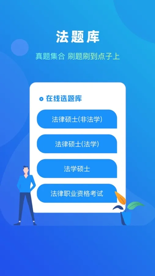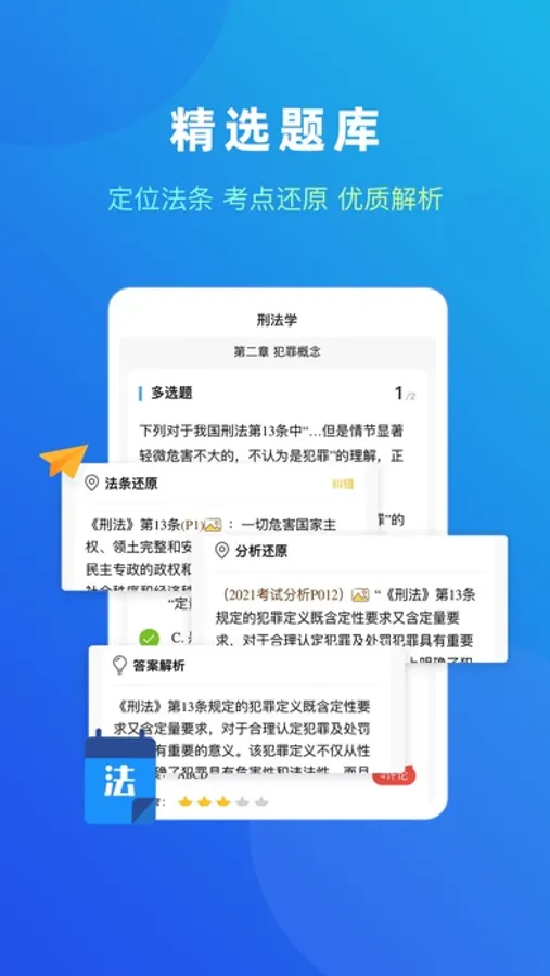 1. 涵盖各类法学考试的真题,提供错题、笔记、收藏等实用功能,实现随时学习,实时整理的功能。