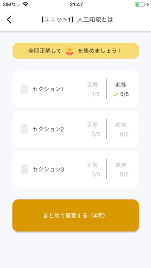 各カテゴリごとの理解度をチェックし、すぐに学習の穴を埋めることができます。全問正答するとバッチを獲得し、自身の頑張りが可視化され、間違えた問題は復習フラグがつき、いつでも復習が可能です。