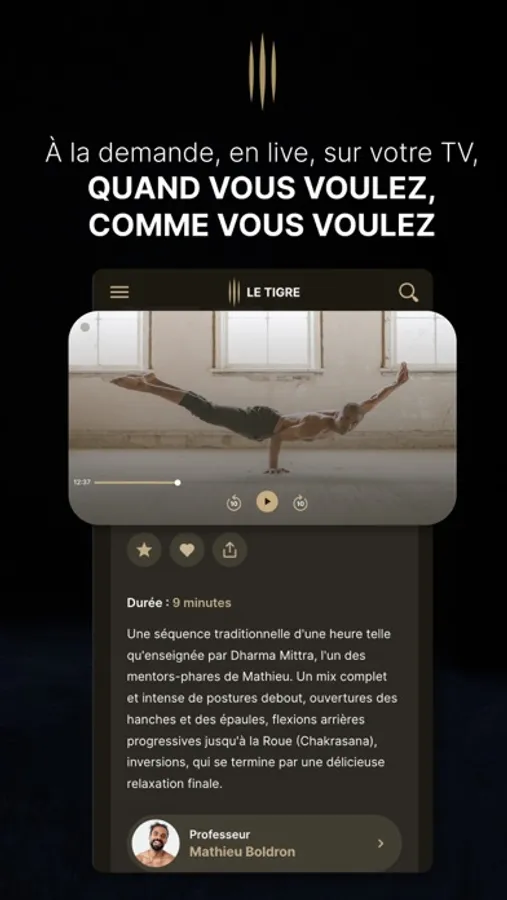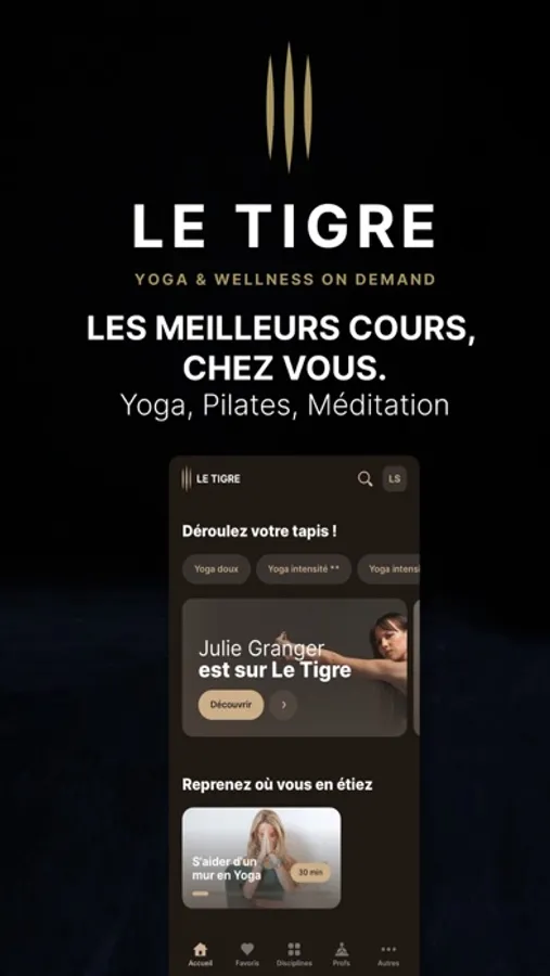 Yoga, Pilates, Méditation, Barre et danse, Fitness… Avec l’application Le Tigre, accédez en illimité aux cours des meilleurs professeurs ! En cours vidéo à la demande ou en Live, pratiquez comme vous voulez et quand vous voulez.