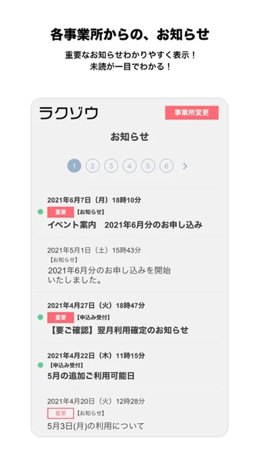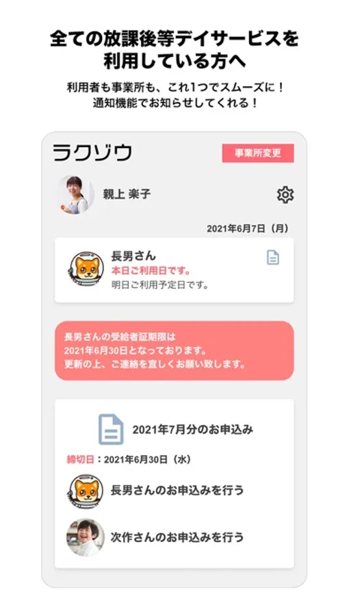 受給者証の更新や、事業所への登所日のお知らせ機能で安心。