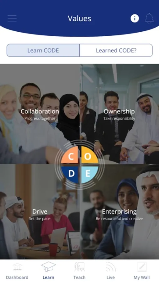 • In the Learn tab, you can view and access the learning content related to CODE, the four Values of the Emirates NBD Group.