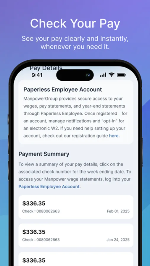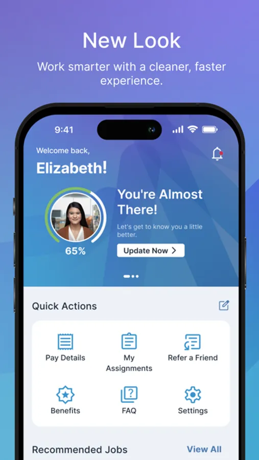 •Real-Time Access: View assignment details, onboarding tools and pay stubs anytime, anywhere.