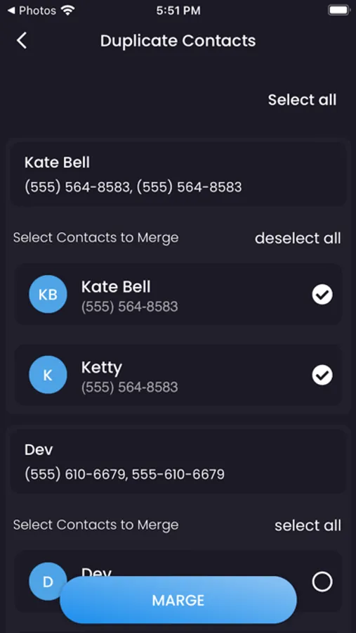• Merge contacts: Optimized duplicates contacts and marge them.