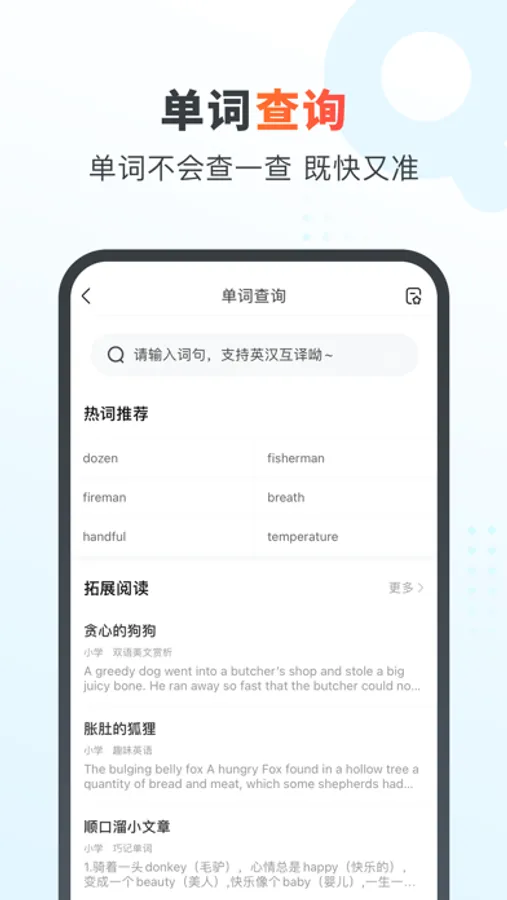 阅读遇到陌生英文单词?写作文想不到单词怎么说?不用慌,中英互译,长句短句,单词查询通通帮你解决。