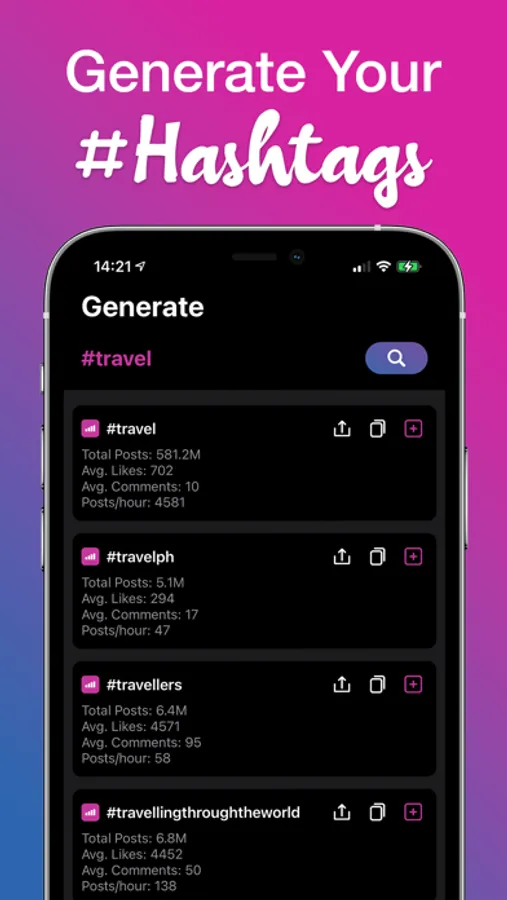 Generate many hashtags for your posts from a single word which will serve as a main subject. For some results you will see a short analysis of its popularity*.