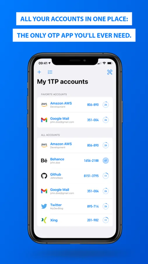 You can store as many accounts as you need in 1TP. Whether email tool, game access or development console. In 1TP, a secure one-time password is generated for almost every service.