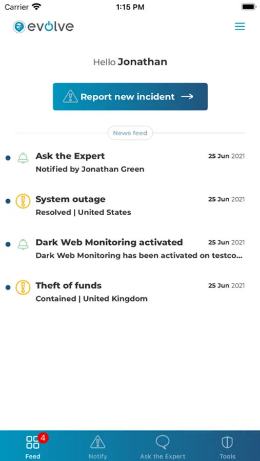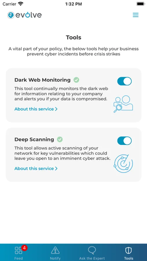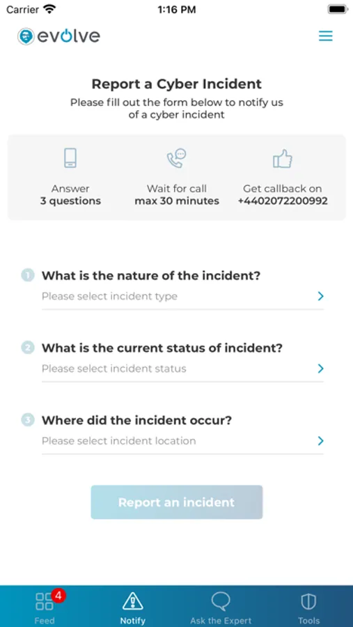 The Evolve incident response app gives you the ability to instantly notify our incident response team of a cyber event. The app includes a tailored threat intelligence feed, direct access to our world-class cyber incident response team via the 'Ask the expert' functionality, and a number of tools to help you protect your business against cyber attacks.