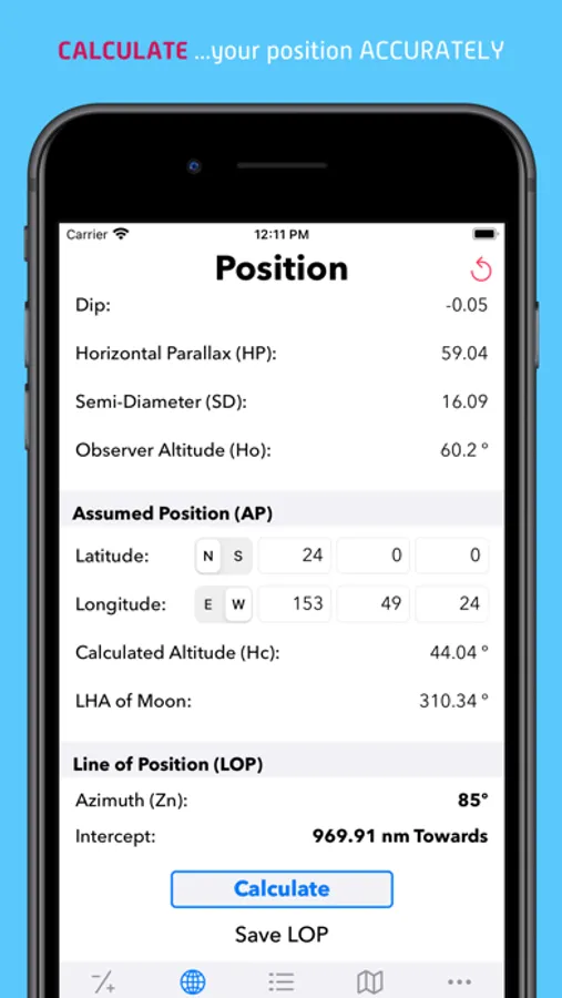 • Line of Position (LOP) intercept data for accurate course and speed adjustments