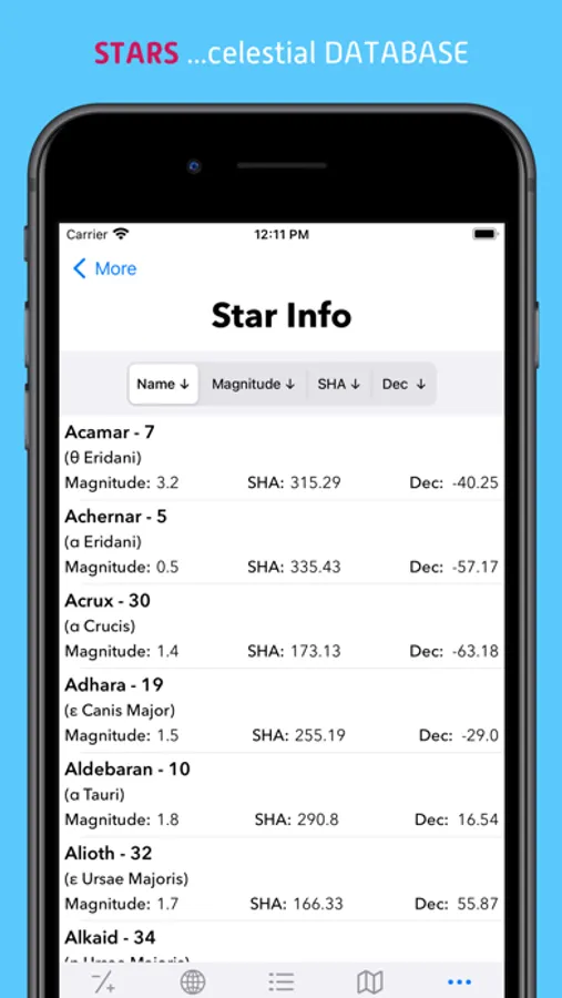 Supported stars: Acamar, Achernar, Acrux, Adhara, Aldebaran, Alioth, Alkaid, Alnair, Alnilam, Alphard, Alphecca, Alpheratz, Altair, Ankaa, Antares, Arcturus, Atria, Avior, Bellatrix, Betelgeuse, Canopus, Capella, Deneb, Denebola, Diphda, Dubhe, Elnath, Eltanin, Enif, Fomalhaut, Gacrux, Gienah, Hadar, Hamal, Kaus Australis, Kochab, Markab, Menkar, Menkent, Miaplacidus, Mirfak, Nunki, Peacock, Polaris, Pollux, Procyon, Rasalhague, Regulus, Rigel, Rigil Kent., Sabik, Schedar, Shaula, Sirius, Spica, Suhail, Vega, Zubengenubi
