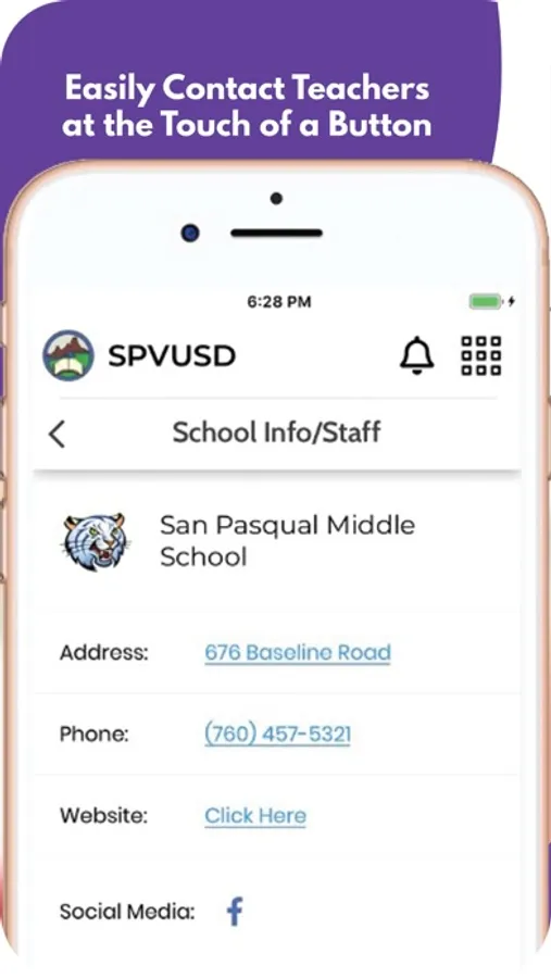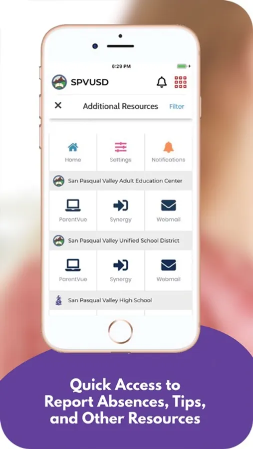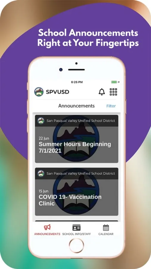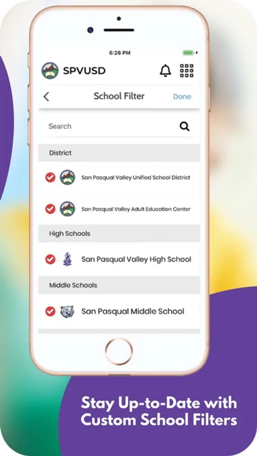 The app includes information for the district and all schools. Filter by the school your child attends to feature information for that school.