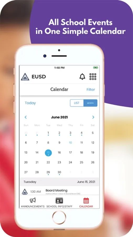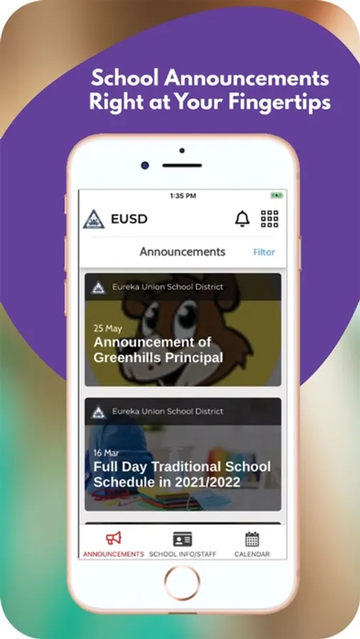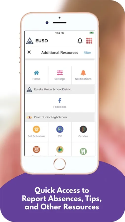The app includes information for the district and all schools. Filter by the school your child attends to feature information for that school.