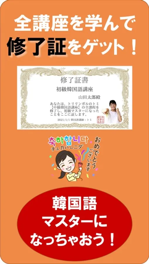 なんと、私の講座を全て修了したあかつきには、修了証が発行されます。つまり、皆さんの韓国語の実力を私が認定します!