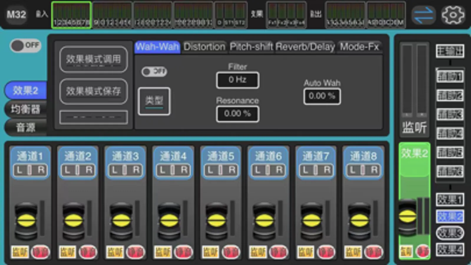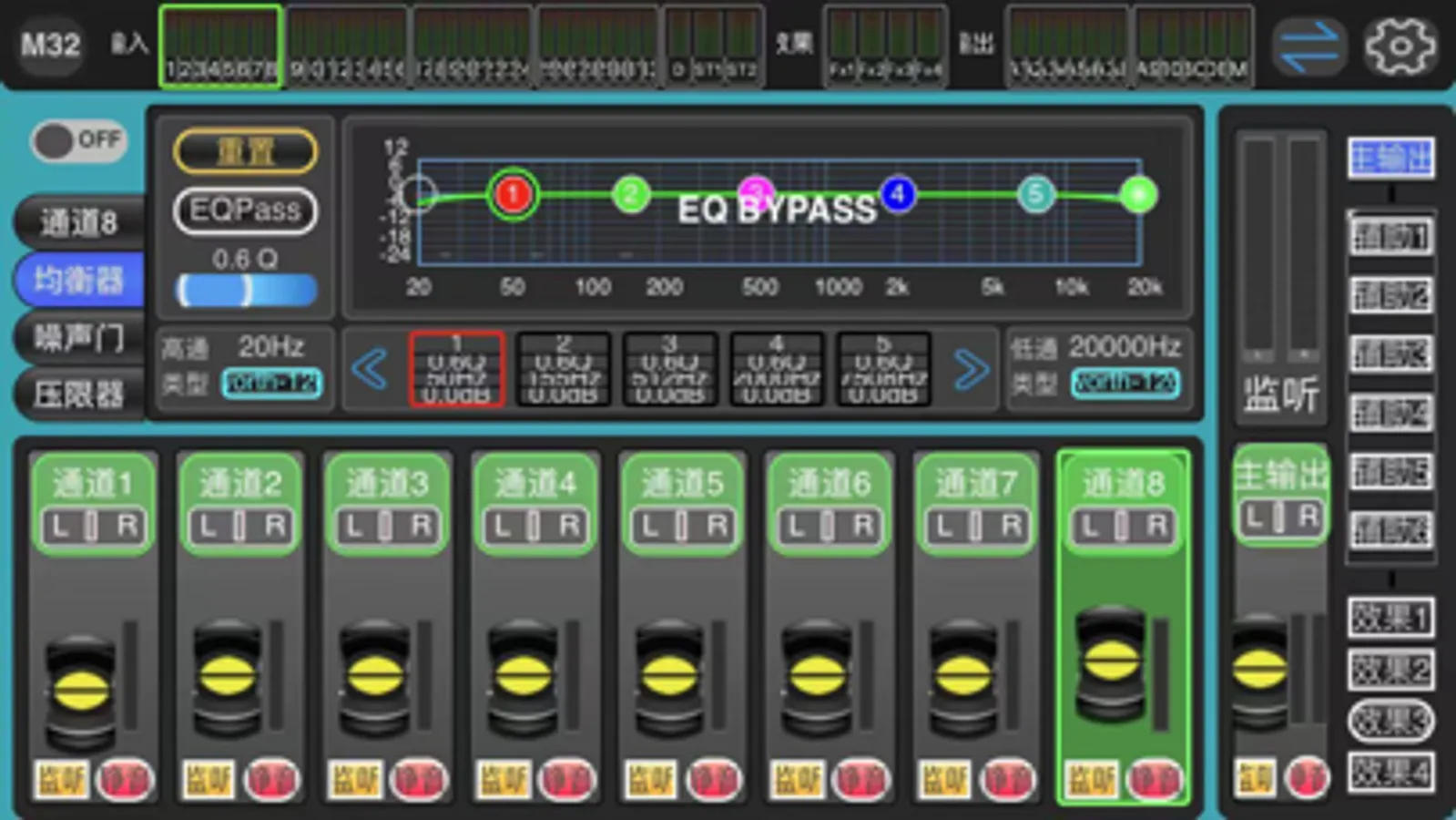 •输出通道处理:高低通滤波,15段参量均衡,主输出31段(GEQ支持通过在推子上操控),压缩器,延时,相位