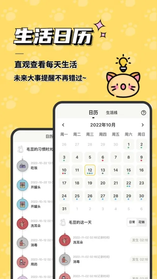 周期查看宠物每天行为、每日开销情况、日历还支持查看未来提醒事件,再也不会忘记要给宠物做的事情啦~
