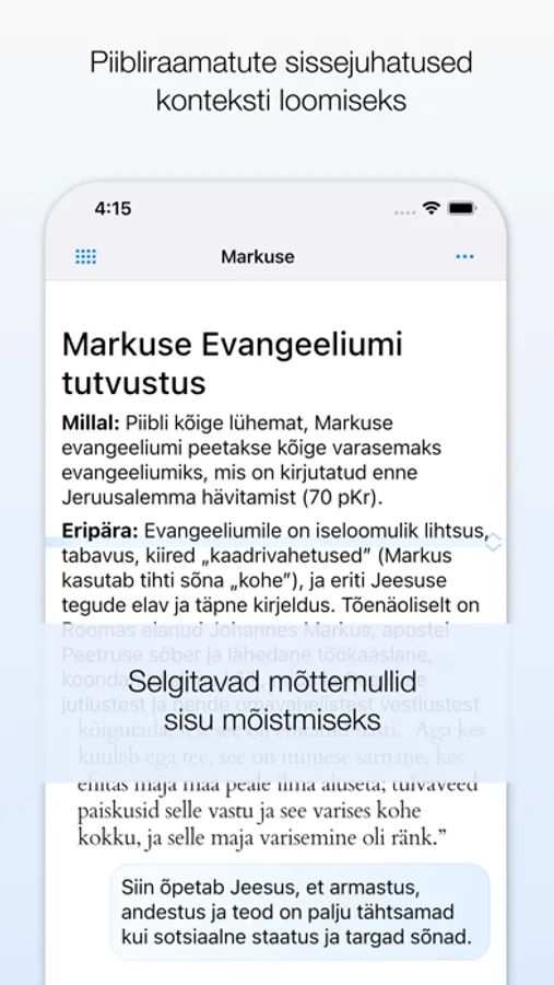 Piibel+ (testversioon) on kaasaegne viis telefonis lugeda ja uurida Piiblit. Äpp aitab teksti lugemisel sügavamale minna, mõista tähendust, konteksti ja palju muud.