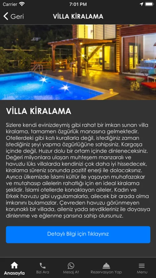 Kiralık villa ve Kiralık yazlık sektöründe 7 yıldır Türkiye’nin lider konumunda olan firmamız, sizlere en uygun kiralık villa ve kiralık yazlıkları bulmanıza yardımcı olmaktadır. İsteğinize bağlı muhafazakar villalar, korunaklı villalar, balayı villaları ve özel günleriniz için günlük, haftalık kiralama konusunda farklı seçenekler ve fiyat avantajları ile hizmet vermektedir. www.kiralikvilladatatil.com internet sitesi üzerinden online olarak villanızı seçebilir, rezervasyon yapabilir ve kredi kartı ile taksitli olarak ödemenizi yapabilirsiniz.