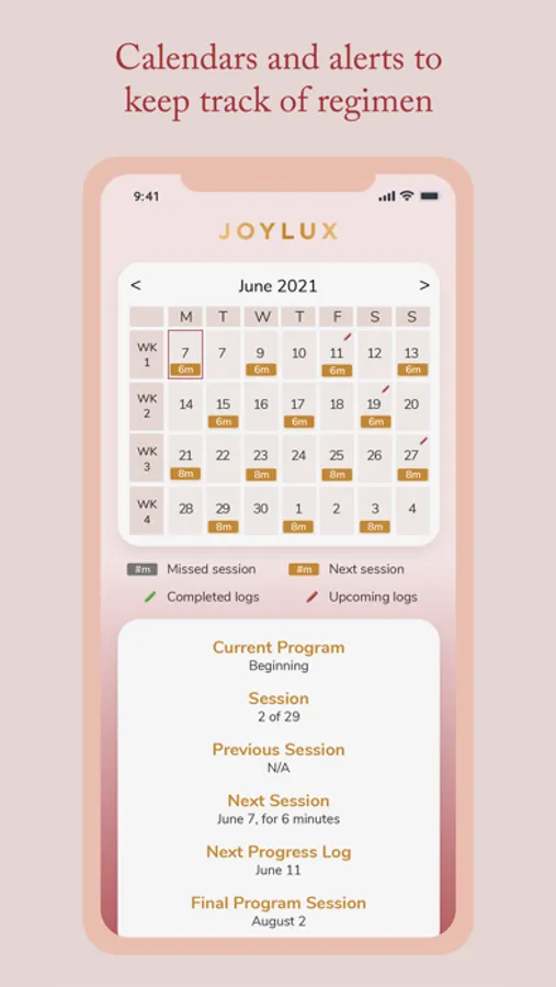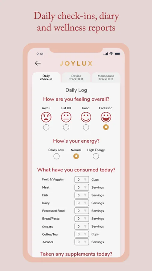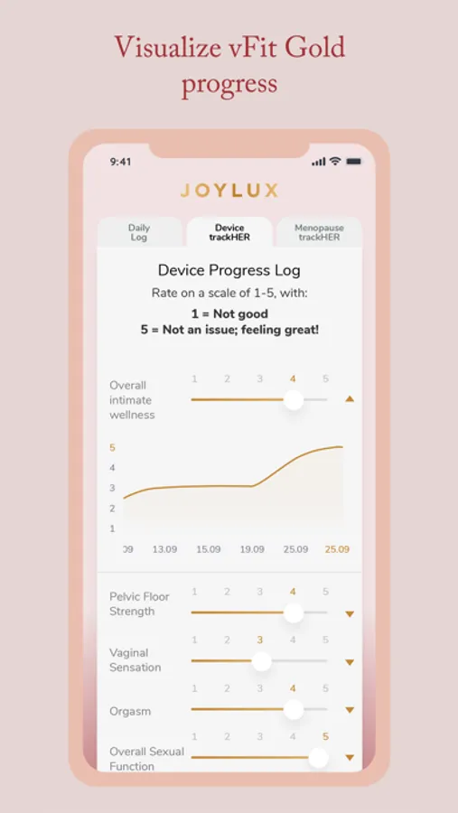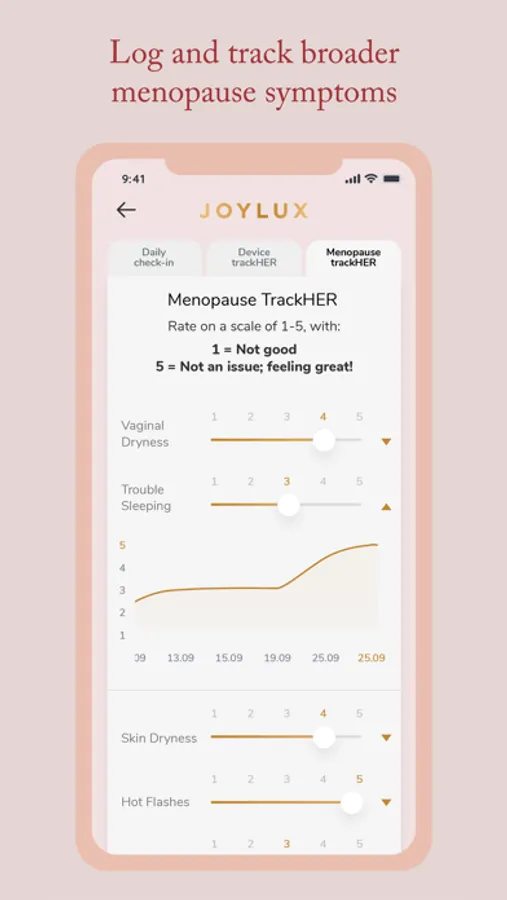· As you move through our customized pre-programmed treatment protocols with your Joylux device, use our personalized daily tracker to get insights into the menopause symptoms that impact your life the most, view your improvement scores, and track your results.