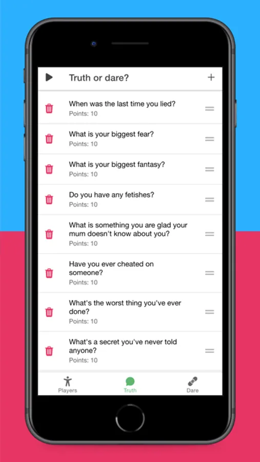 This is the ideal Truth or Dare app for parties, sleepovers, couples, orgies, and sex parties.