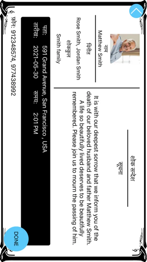 The card made using this app will save in device Gallery and Also, Allows easy way to share the card in social media so that your relatives will know about the incidence.