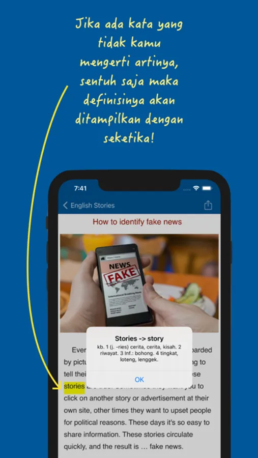 2. Ketika pembaca menemukan kata bahasa Inggris yang tidak dimengerti artinya, pembaca dapat menyentuk kata tersebut pada layar device-nya. Dengan seketika arti dari kata tersebut akan tampil di layar. Tidak hanya artinya, tapi dilengkapi juga dengan bentuk kata dasarnya.