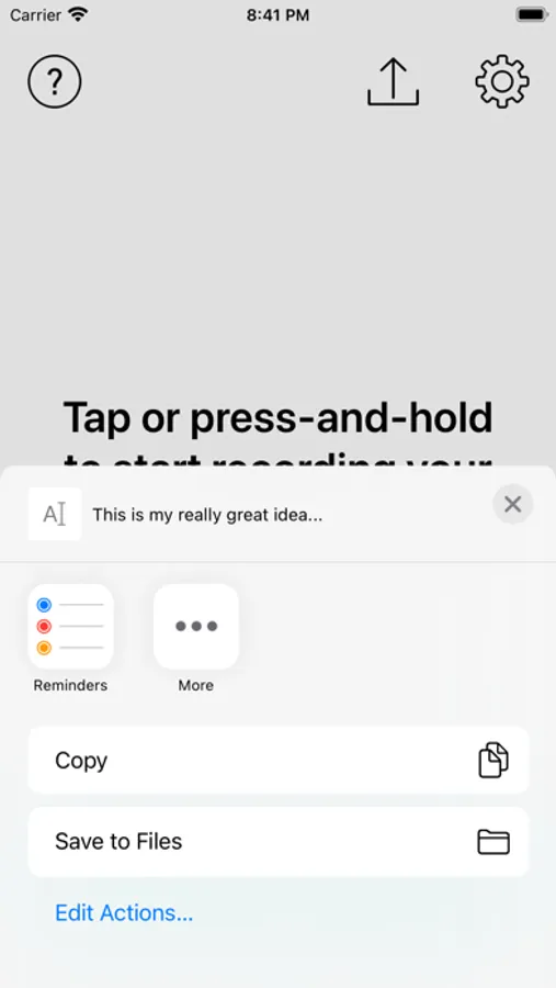 The app will then transcribe your idea into text and allow you to share it. I always just share with myself (via email), but you can share with anyone via any of the standard iOS share options (Messages, Email, Copy, etc).