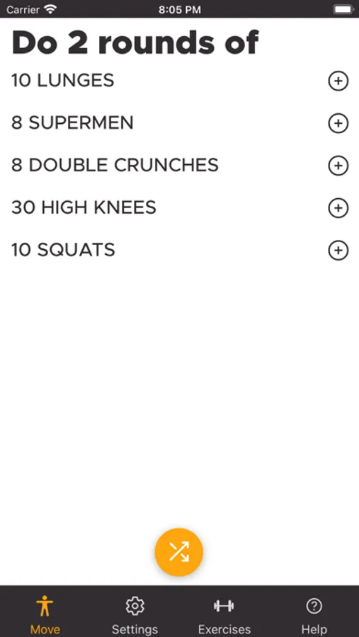 Move Mo is a random workout generator. Random means no thought, no planning, and no time required to create a workout. Press one button and perform the exercises. That's it.