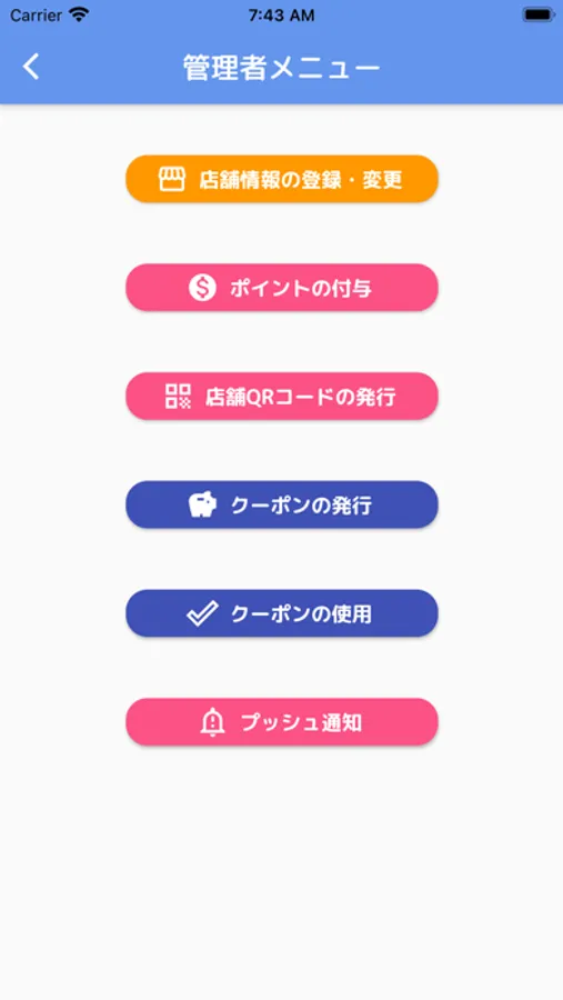 必要最低限の機能を備えたシンプルなポイントカードアプリ「かんたんポイントカード」の管理アプリ。店舗情報の登録、ポイントカード画面のカスタマイズ、ポイントの付与、クーポンの発行、プッシュ通知の実行などを行うことができます。