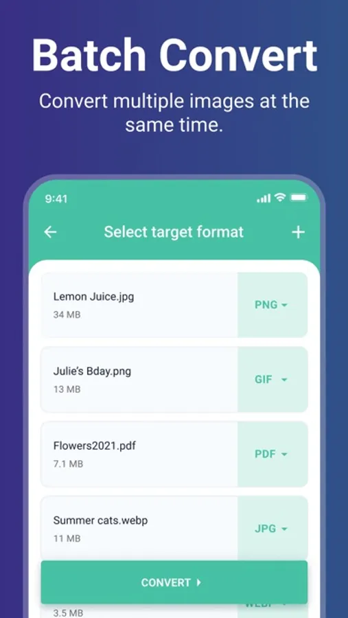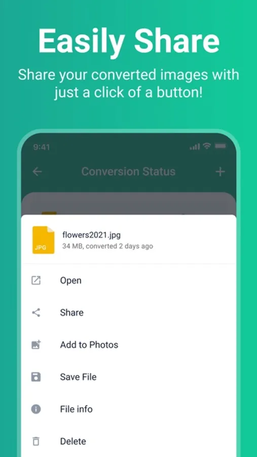 Select an image from your phone and choose a target format. Then, just click Convert! It is as simple as that. After conversion, you can easily share your photos with friends.