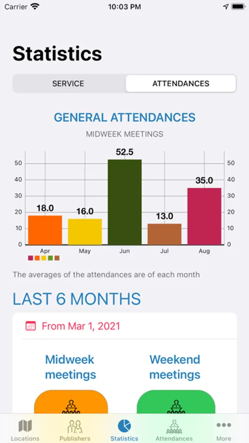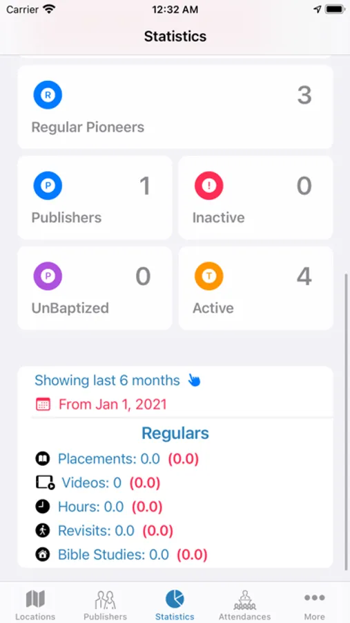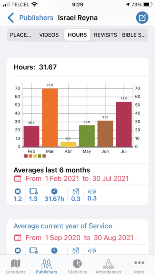 Calculate publisher posts, videos, hours, return visits, and courses. You can check it by category (Precursor or Publishers) and you can choose to view the last 6 months or by the month you like from the last 6.
