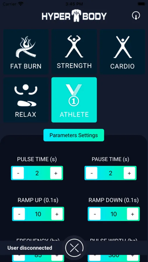 The Hyperbody APP is used to control the steady and continuous output of electrical pulses from the smart Hyperbody controller. EMS technology mimics the human brain by sending electrical signals to stimulate motor nerve endings with a low frequency pulse using small amounts of electrical current. By controlling the electrical pulse and current safely, regulating the frequency and