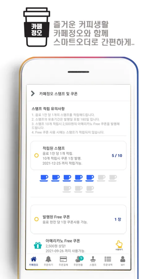 - 스탬프 : 회원님께서 주문한 상품에 따라 스탬프를 드리며 일정 스탬프 수량이 채워지면 쿠폰을 발행해드립니다. 스탬프와 쿠폰 현황을 확인하실 수 있습니다.