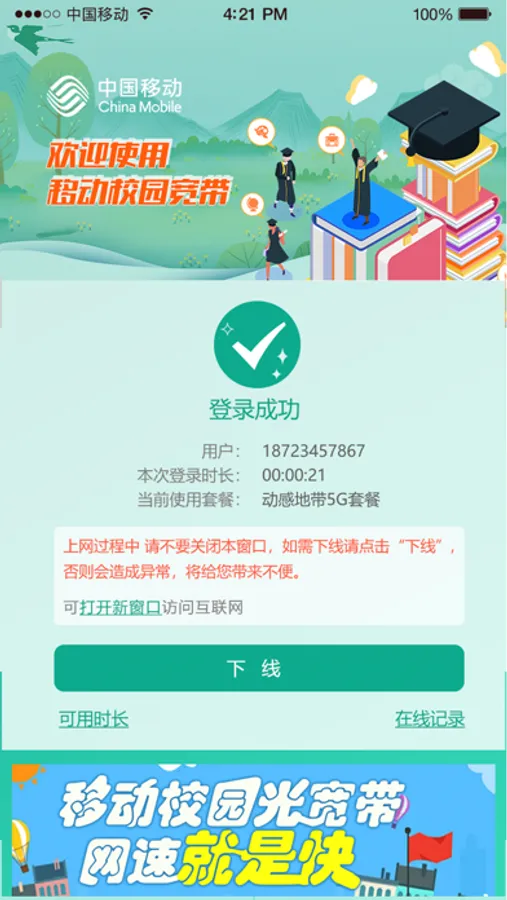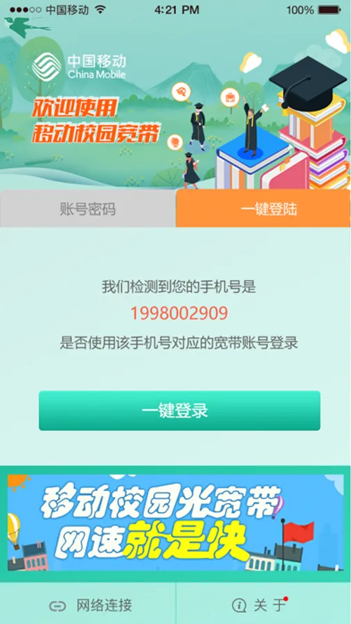 应用简介:随着信息技术的不断创新,信息化校园建设的不断深入,带动了移动应用的快速发展。为了更好的服务于全校师生, 中国移动甘肃公司现推出校园宽带应用,可良好的支持iPhone和ipad终端,为校园用户提供短信验证码登陆和一键登陆两种拨号方式。目前已推出的功能将会在未来不断的完善和充实,为全校师生的工作和生活提供更为贴切的宽带服务。