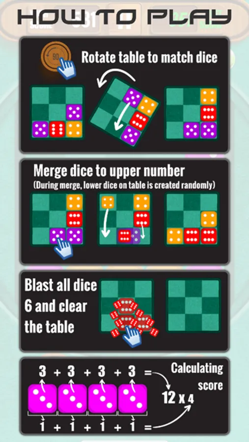 • Match 2 same dice then click dice to merge upper dice until you reach up to dice 6