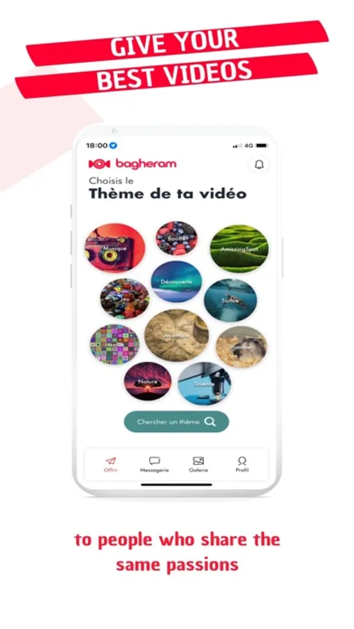 Bagheram is an app that lets you send a video to someone you share a passion with. Each day, choose one of your surprising videos to send to another Bagheramer in the world. With only one goal: to make someone smile!