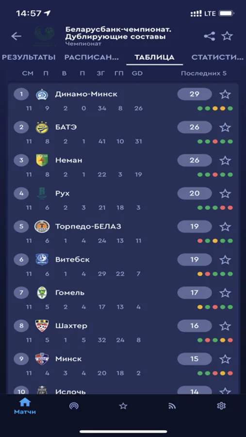 · Простая для понимания цветовая индикация исхода матча: зеленый цвет — победа, желтый — ничья, красный — поражение