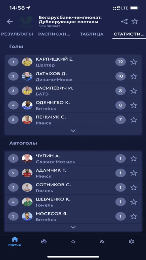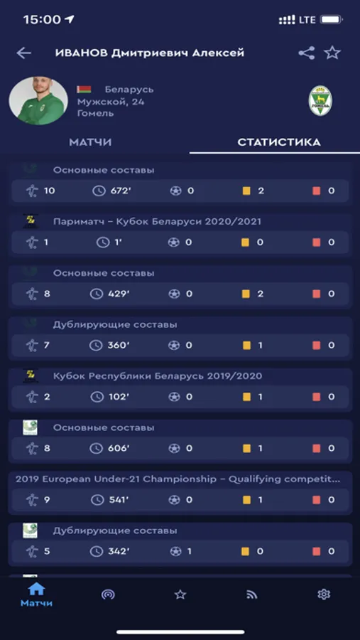 · Персональная статистика футболистов, включающая: количество сыгранных матчей и количество минут, проведенных игроком на поле в рамках соревнования, забитые мячи, желтые/красные карточки