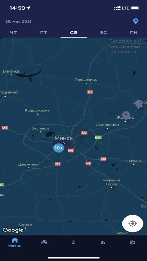 · Просмотр на карте всех матчей, сыгранных в определенный день, с использованием геолокации