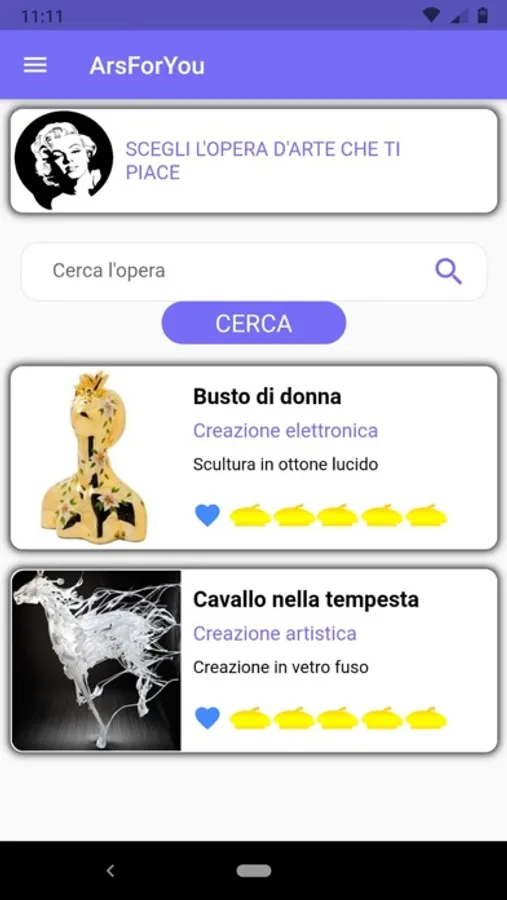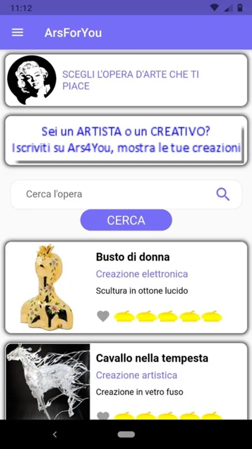 Ars4You è una galleria all’interno della quale artisti e creatori di opere di ingegno di tutto il mondo possono esporre le proprie opere d’arte, le proprie creazioni facendole conoscere in tutto il mondo. Gli utenti, visitando l’app o il sito internet, potranno acquistare le opere e le creazioni pubblicate o chiedere all’artista la realizzazione di opere o creazioni personalizzate. Gli artisti possono presentare le loro creazioni realizzando dei video che illustrano l’opera.