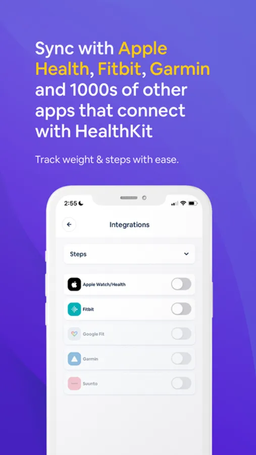 Sync with Apple Healthkit, Fitbit, Garmin & Google fit to track your steps and weight seamlessly.