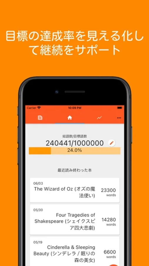 このアプリでは、目標の語数を設定してその目標をどの程度達成できているかを見える化することで、あなたの多読のモチベーション維持をサポートします。