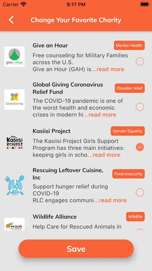 The app allows each user to select their own charity of choice by picking from a variety of charities that represent different needs, such as disaster relief, mental health, food insecurity, and gender inequity.
