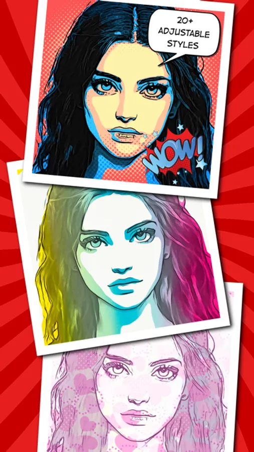 The Stylize stage contains 20+ custom styles that cartoonize or colorize your photo: Cartoon, Smooth, Details, Grayscale, Comic, Hope, Halftone, Money, Grunge, Red, Green, Blue, Graphite, Sketch, Blueprint, Hot 1&2, Funky, Watercolor 1&2, Color Splash 1&2, Seaside, Pastel, and Valentine.