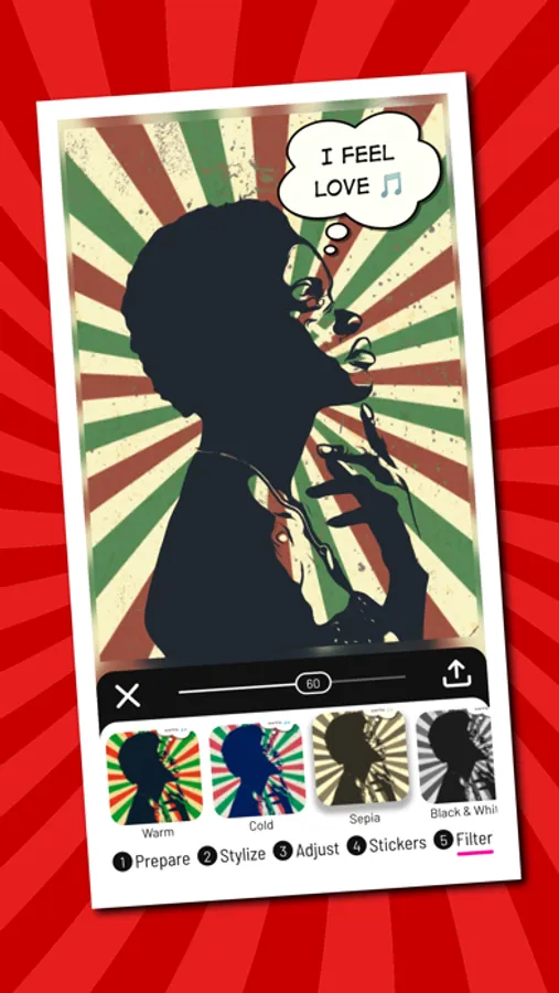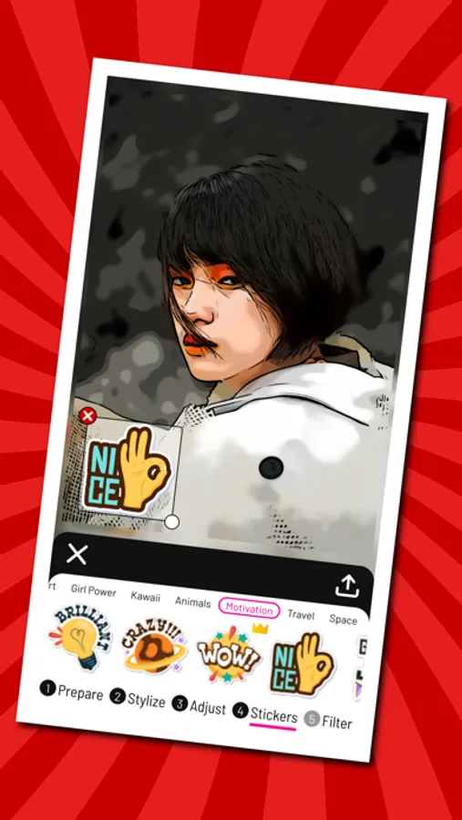(1) Prepare → (2) Stylize → (3) Adjust → (4) Stickers → (5) Filter